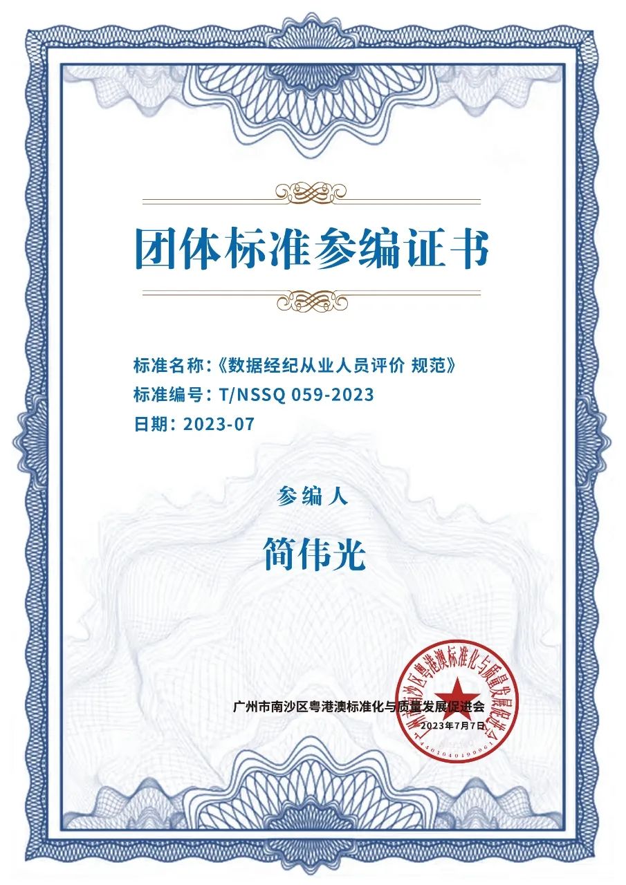 ▲图为2138cn太阳集团城大数据业务部总经理简伟光参编证书