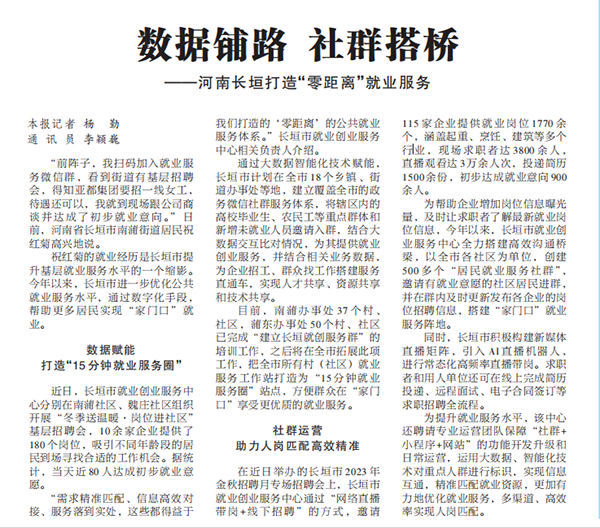 12月15日,《中国劳动保障报》在就业创业专版刊发了《数据铺路 社群搭桥——河南长垣打造“零距离”就业服务》一文,深入报道了河南长垣创新打造的“数据赋能+社群运营”就业创业服务新模式,获得群众广泛好评。