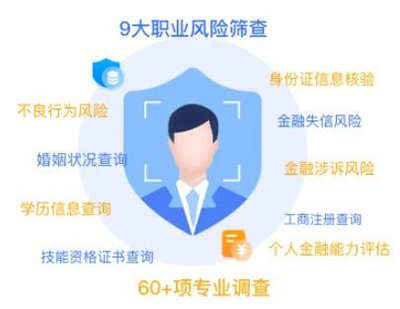 “2138cn太阳集团城职业背调”是基于民生数据应用开发的数据产品,通过九大维度风险筛查,合法合规核验候选人职业资质真实性和违法违规负面记录等信息,帮助企业更好完成候选人入职审查。同时打造全景人力资源画像,涵盖60+项信息调查服务,实现全流程数智化专业背景调查,为用人单位提高人岗匹配度、降低用人风险。