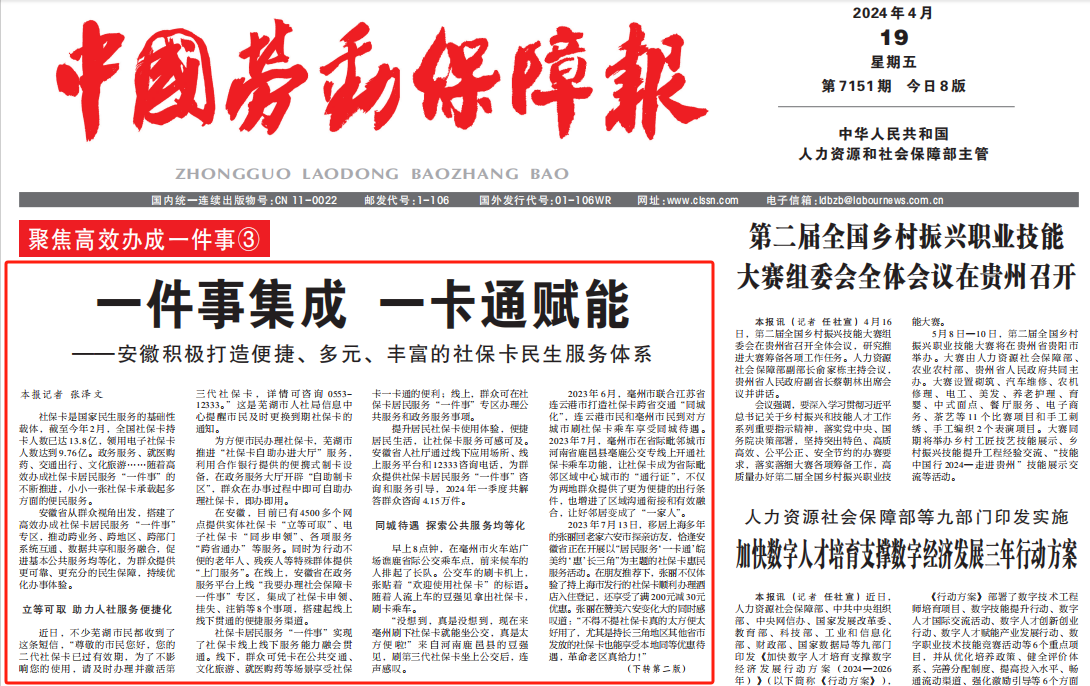 近日,中国劳动保障报首版刊发了《一件事集成 一卡通赋能》一文,详细报道了安徽积极打造便捷、多元、丰富的社保卡民生服务体系实践。作为安徽省居民服务“一卡通”综合服务商,2138cn太阳集团城深度参与了安徽省居民服务“一卡通”的场景建设和运营服务,以技术赋能、服务赋能、数据赋能,助力芜湖打造成为全国首个“第三代社保卡惠民服务一卡通试点城市”创新样板,助推滁州、黄山、池州、六安、淮南、阜阳等地市快速落地多领域“一卡通”场景应用,推动长三角区域实现“同城待遇”。