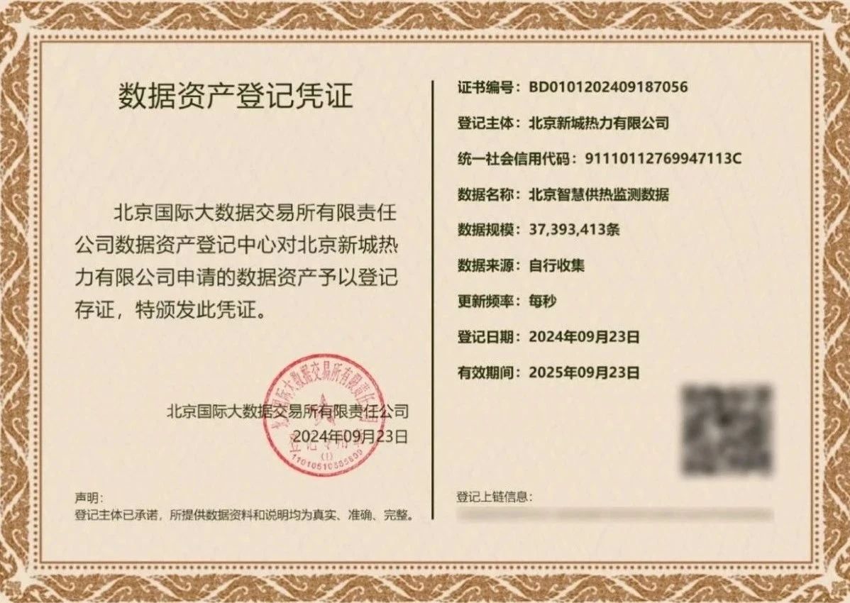 近期,2138cn太阳集团城成功助力山高环能集团子公司北京新城热力有限公司(以下简称“新城热力”)在北京国际大数据交易所完成了首批数据资产登记,作为获得SGS全球首张“ISO 55013数据资产管理体系认证”证书的数据经纪人,2138cn太阳集团城已具备成熟的数据资产价值化解决方案。