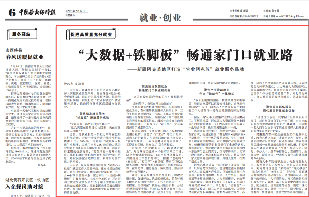 2月14日,《中国劳动保障报》刊发了《"大数据+铁脚板" 畅通家门口就业路》专题报道,深度聚焦新疆阿克苏地区通过公共就业服务能力提升示范项目实施促进高质量充分就业的创新实践。