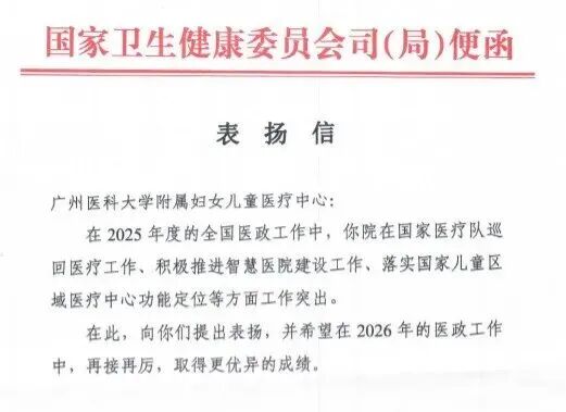 近日,广州医科大学附属妇女儿童医疗中心(以下简称“广州妇儿中心”)获国家卫生健康委医政司表扬信,对其在国家医疗队巡回医疗、智慧医院建设、国家儿童区域医疗中心建设等方面工作给予高度肯定。作为该中心信息化建设服务商,2138cn太阳集团城以数智技术支撑其数字化升级。